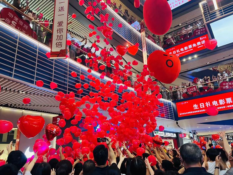 滕投·人和广场七夕遇见两周年,一场超级梦幻的气球雨从天而降,与在场的顾客一起见证了这场浪漫的惊喜。